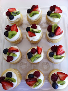Frost about 1 tbsp. of butter cream frosting, acting as your glue. Place a cookie on top and secure, gently pushing down. Then frost your cookie with butter cream frosting, and place your fresh fruit on top. Serve same day. Makes 24 cupcakes.