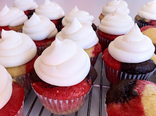 Line your muffin tins with paper liners. Using your small cookie scoop, place about 1 tbsp. of each flavor of batter into each liner, then repeat until liners are 3/4 full. Bake at 350 degrees for 12-15 minutes. Remove from the oven and cool completely. Frost with Vanilla Buttercream frosting.