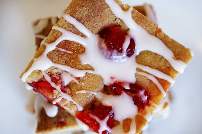 Slowly beat in the flour and salt. Spread batter over a greased cookie sheet or smaller jelly roll pan. Sprinkle batter with cherries. Bake at 350 degrees for 15-18 minutes until lightly golden, but soft. Remove from the oven and cool. Mix together milk, ½ teaspoon almond extract and powdered sugar. Whisk together until there are no more lumps, and drizzle over cooled cookie bars. Cut into 1 ½ inch squares and serve. This recipe freezes well without the glaze.